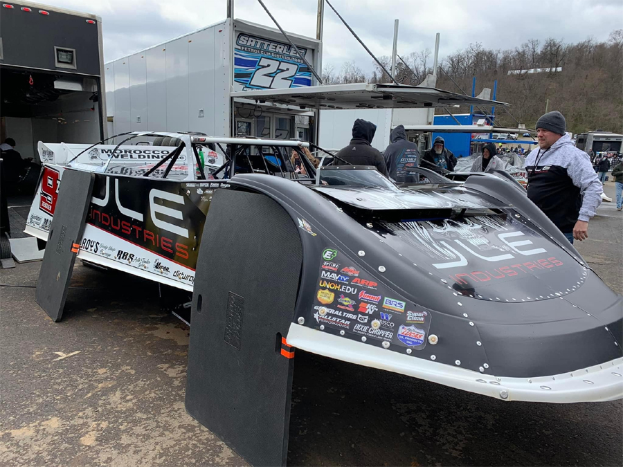 Mason Zeigler sits on jackstands at Port Royal (PA) Speedway in April 2022 -